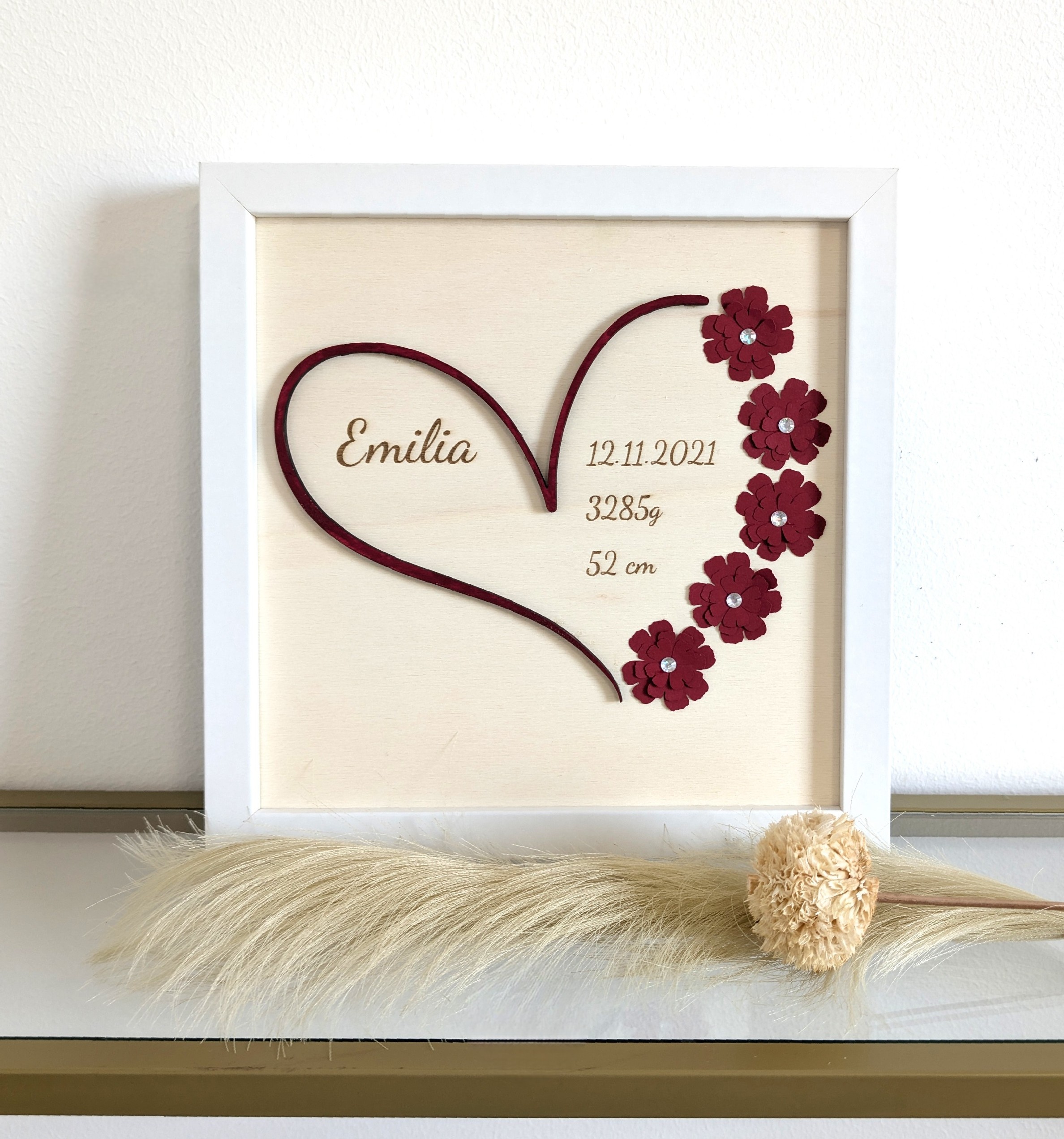 Ein weinrotes Herz, kunstvoll verziert mit Papierblumen, trägt den Namen des Babys sowie seine Geburtsdaten. Ein einzigartiges Andenken und eine wunderschöne Dekoration fürs Kinderzimmer.