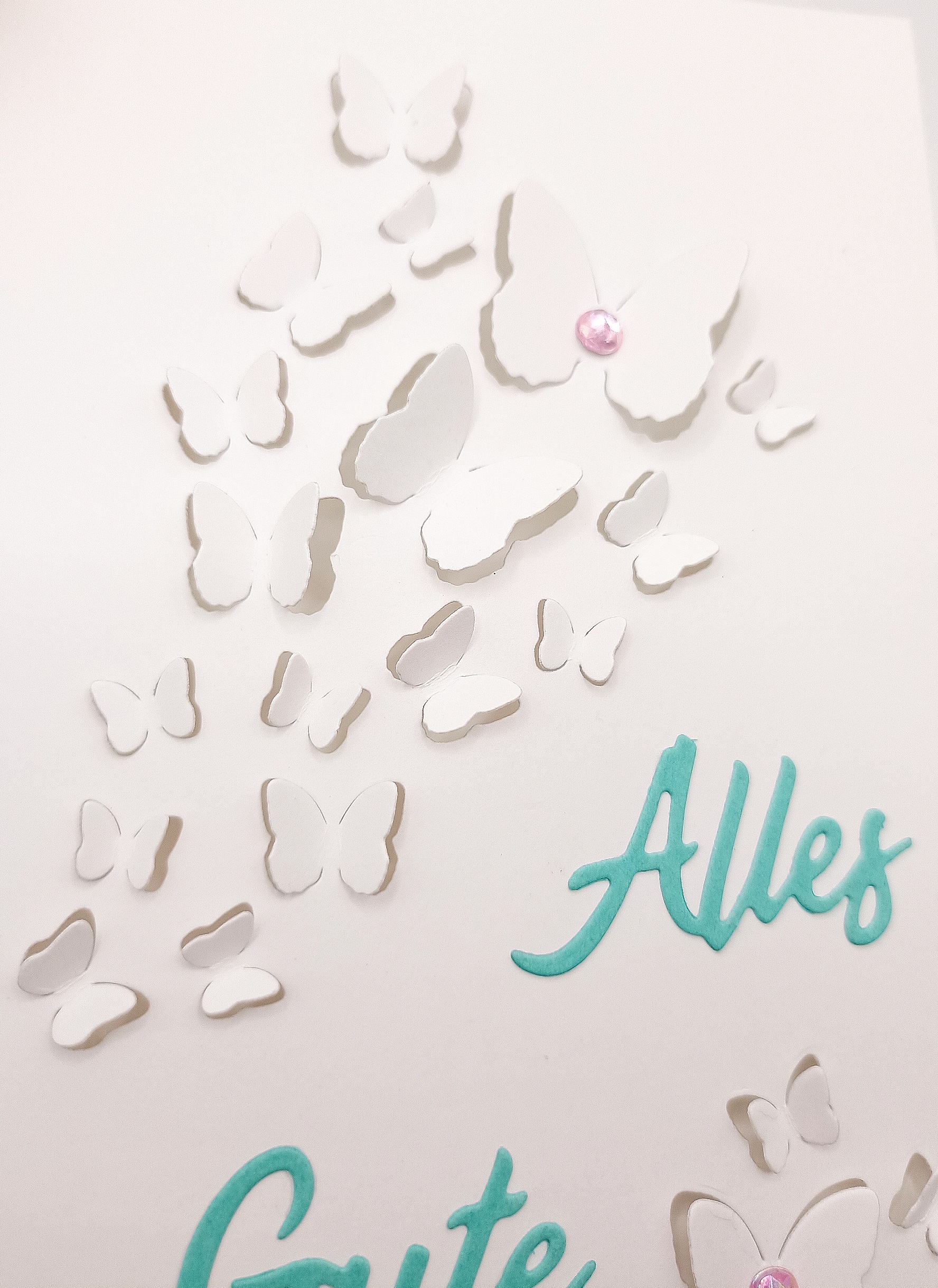 Handgemachte Karte „Alles Gute“ – Weiß Türkis – Schmetterlinge mit Glitzerstein – elegante Grußkarte für Geburtstag oder Glückwünsche