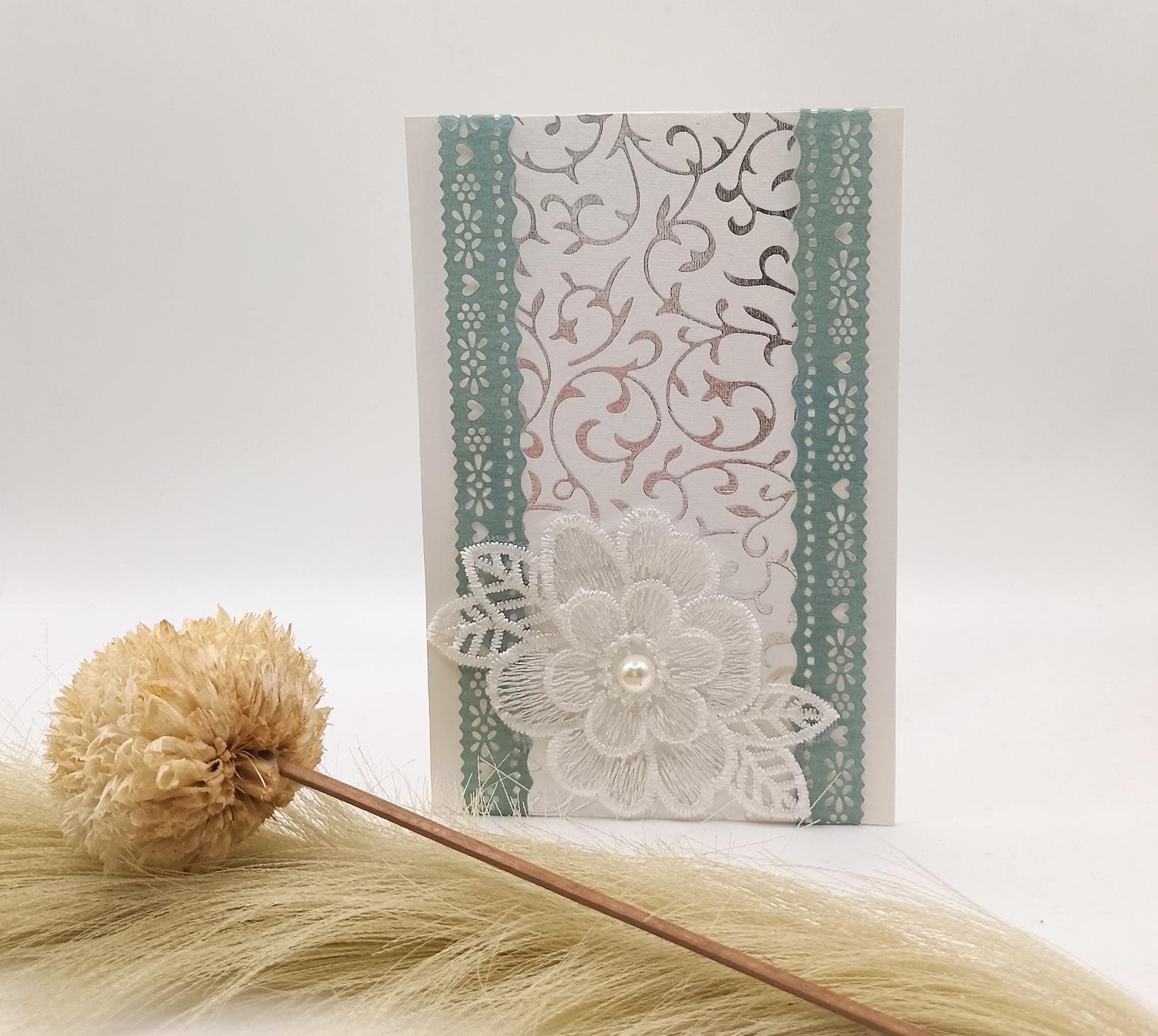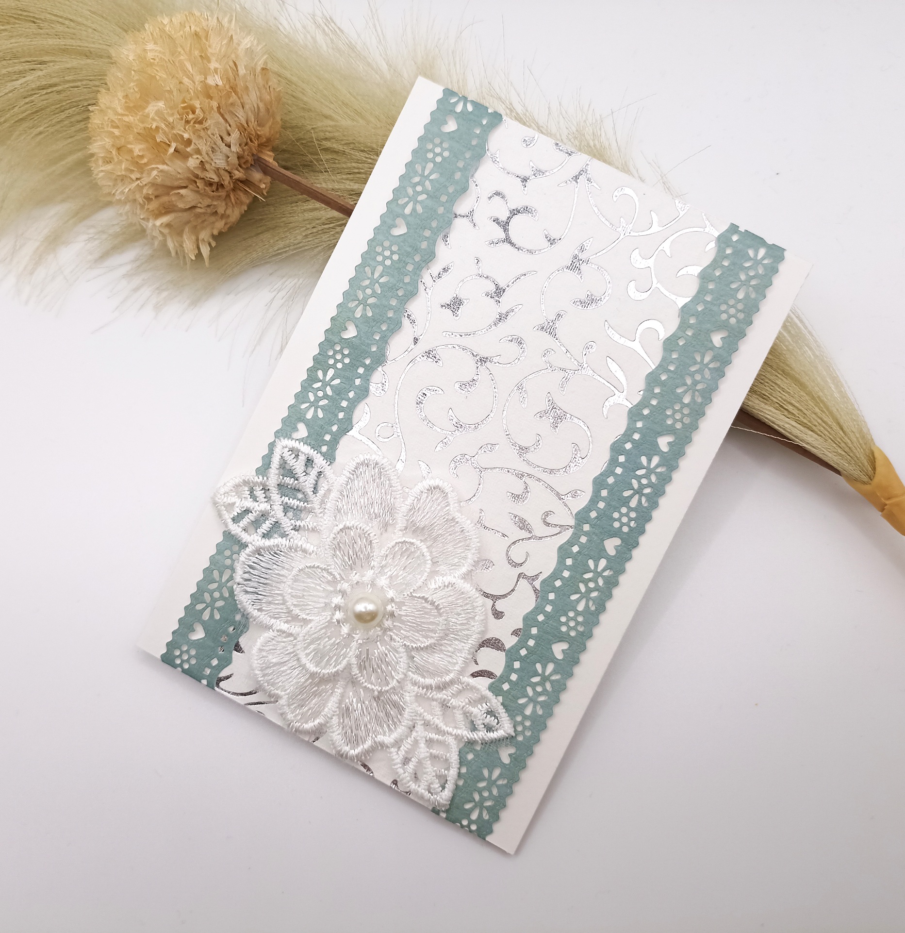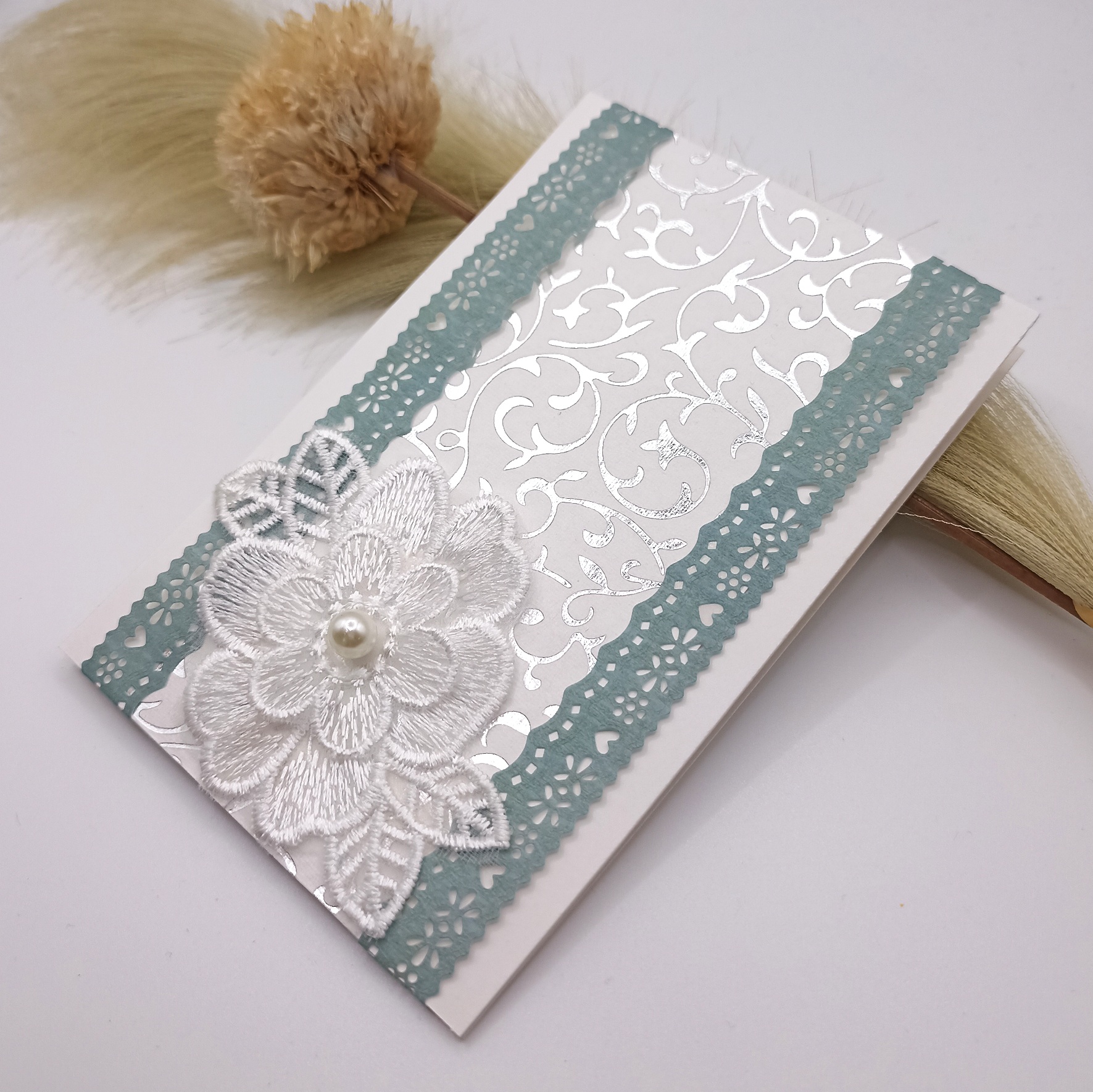 Handgemachte Karte mit Spitze und Perle – Silber Grün Weiß – elegante Grußkarte für Hochzeit, Geburtstag oder Glückwünsche