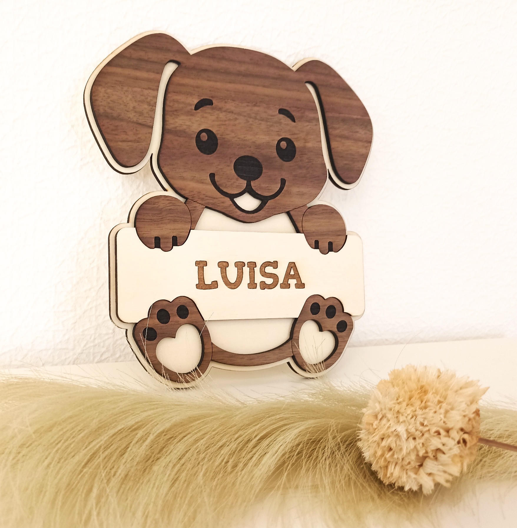 Mit seinem süßen Hunde-Motiv und der individuellen Namensgravur wird es zum liebevollen Hingucker an Tür oder Wand.