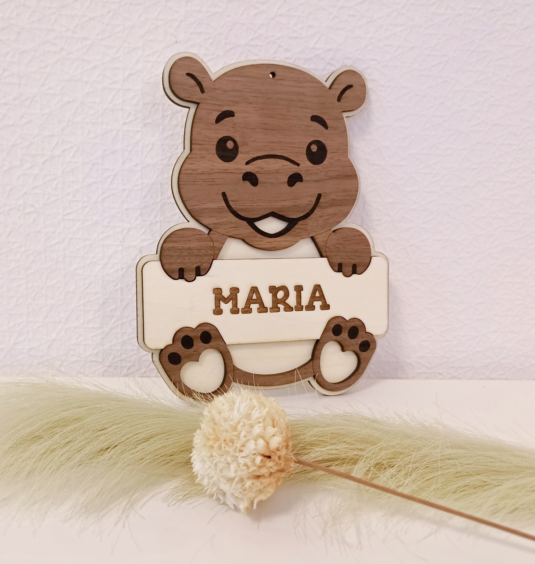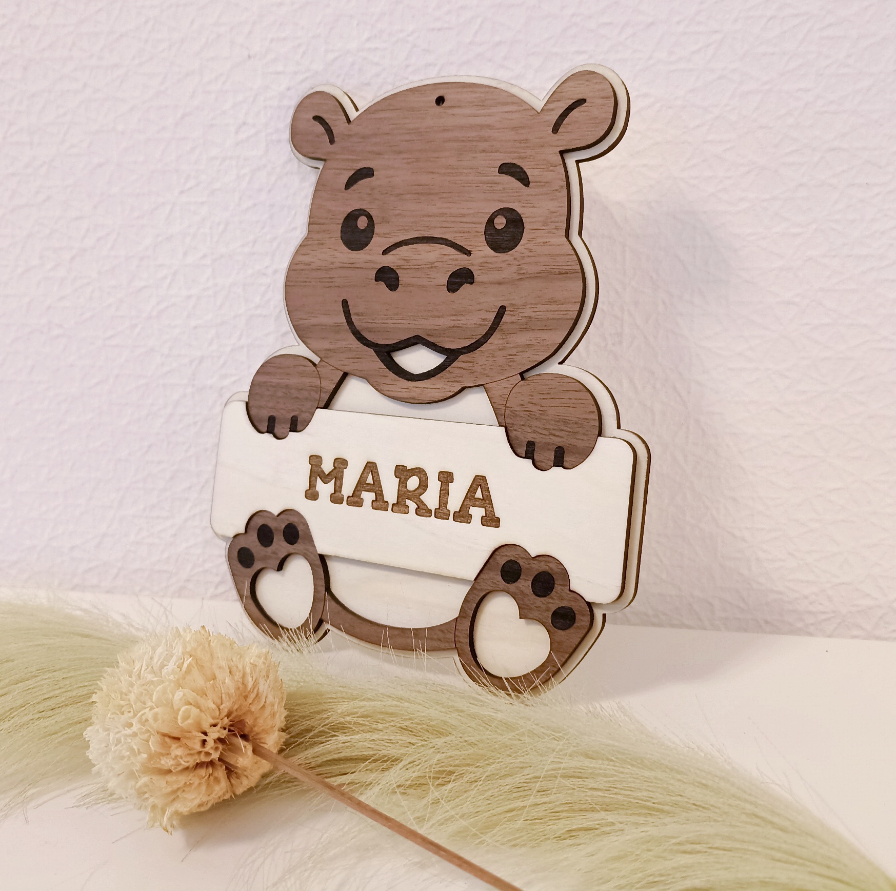 Mit seinem süßen Nilpferd-Motiv und der individuellen Namensgravur wird es zum liebevollen Hingucker an Tür oder Wand.